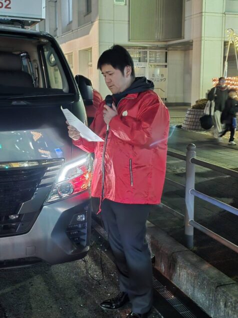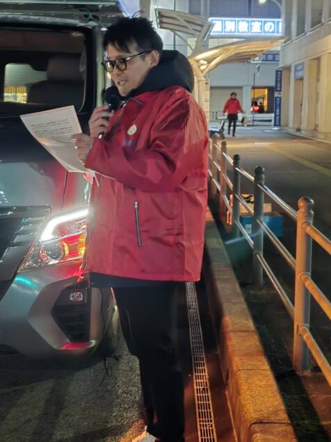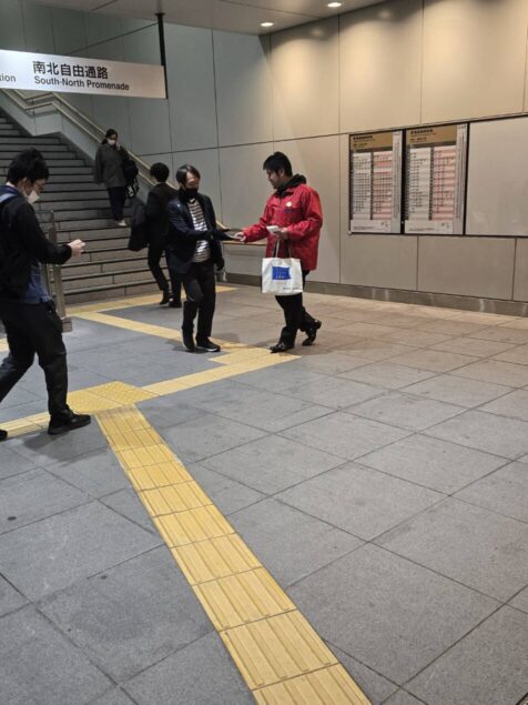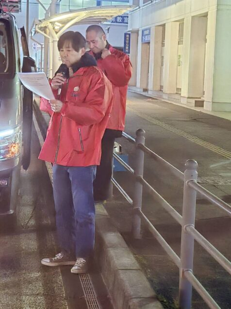 強風が吹き荒れ大変寒い中、推薦議員も参加してくださり、街宣活動を実施するとともに、合わせて最低賃金改定の案内文が入ったティッシュも配布をし、周知活動を行いました。